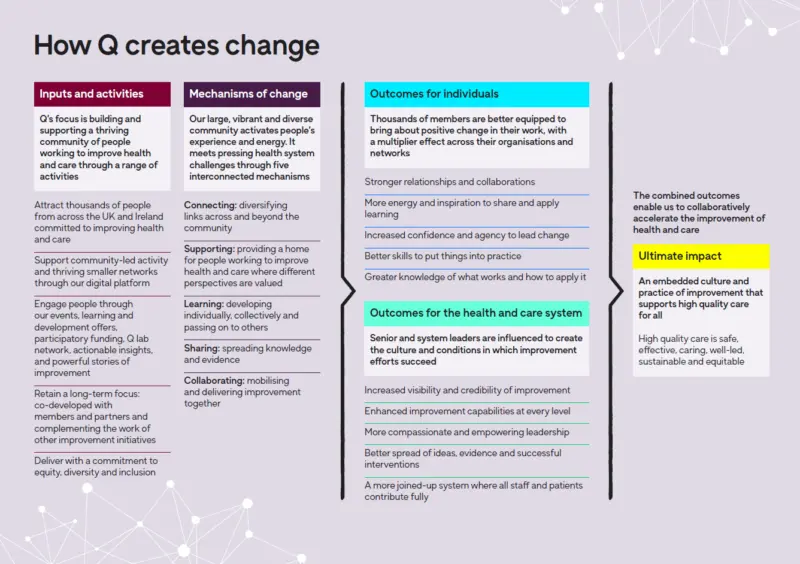 Our theory of change joins the dots. It describes how what we do at Q is expected to enable a culture and practice of improvement which leads to better health and care for people across the UK and Ireland.